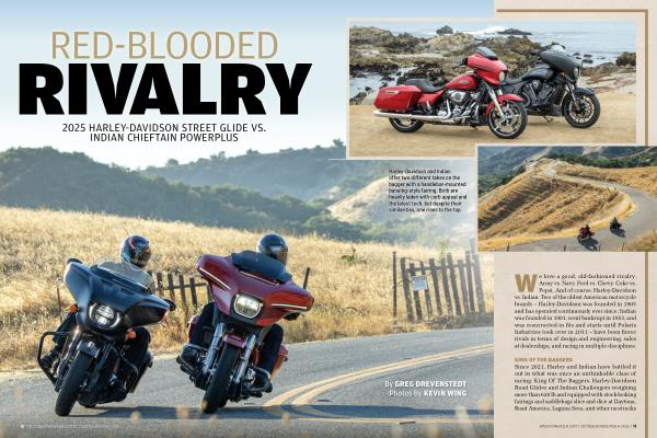 KING OF THE BAGGERS Since 2021, Harley and Indian have battled it out in what was once an unthinkable class of racing: King Of The Baggers. Harley- Davidson Road Glides and Indian Challengers weighing more than 620 lb and equipped with stock- looking fairings and saddlebags slice and dice at Daytona, Road America, Laguna Seca, and other racetracks