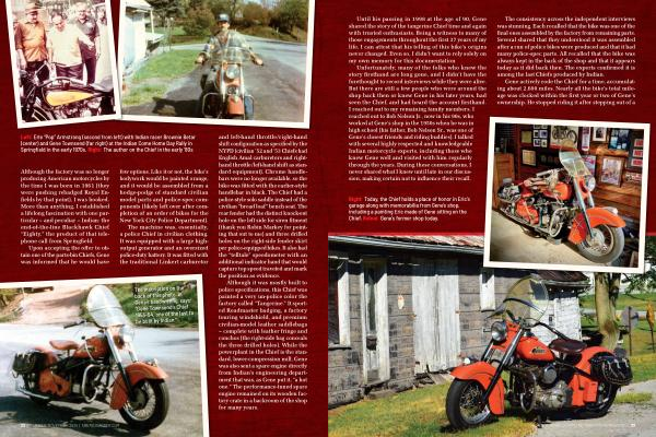 Although it was mostly built to police specifications, this Chief was painted a very un- police color the factory called“ Tangerine.” It sported Roadmaster badging, a factory touring windshield, and premium civilian- model leather saddlebags – complete with leather fringe and conchos( the right- side bag conceals the three drilled holes). While the powerplant in the Chief is the standard, lower- compression mill, Gene was also sent a spare engine directly from Indian’ s engineering department that was, as Gene put it,“ a hot one.” The performance- tuned spare engine remained on its wooden factory crate in a backroom of the shop for many years.