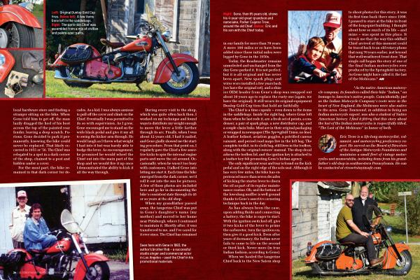 to shoot photos for this story, it was its first time back there since 1998. I paused to stare at the bike in front of the long- quiet building. I thought about how so much of its life – and mine – was spent in this place. It struck me that the way this oddball Chief arrived at this moment could be traced back to an old rotary phone that rang 70 years earlier, just beyond that well- weathered front door. That single call began the story of one of the final Indian motorcycles ever produced by the Springfield factory. As Gene might have called it, the last of the Mohicans.*