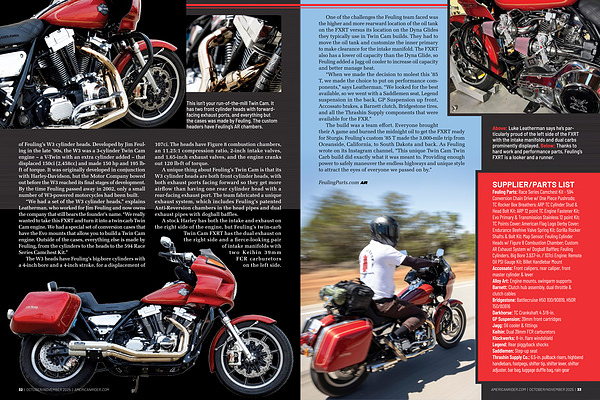 This isn’ t your run- of- the- mill Twin Cam. It has two front cylinder heads with forwardfacing exhaust ports, and everything but the cases was made by Feuling. The custom headers have Feuling’ s AR chambers.