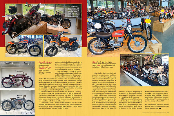Many of the iconic Harley and Indian flat- track bikes are afforded places of honor in the museum, as is the full spectrum of fully faired American roadrace bikes. Clearly, racing is the overriding focus of much of Barber’ s vision.