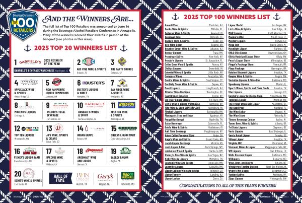 The full list of Top 100 Retailers was announced on June 16 during the Beverage Alcohol Retailers Conference in Annapolis. Many of the winners received their awards in person at the banquet( see photos in this issue).