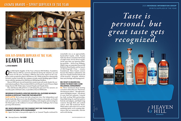Heaven Hill boasts several brands that remain in growth mode despite the current industry pullback. These include 2025 Growth Brands Awards Winners Elijah Craig, Heaven Hill, Widow Jane, Lunazul Tequila and Tequila Ocho.