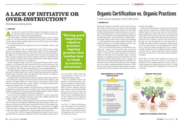 In the wine world, farming in a way that is consistent with organic practices simply means farming without synthetic chemical inputs, in the same way vines were tended before modern agribusiness existed. This choice is not just about doing what’s best for the environment; it’s also the best way to grow the best possible fruit to make the best possible wine, and has been for centuries. In practice, this means that the finer the wine, the more likely it is to have been grown as naturally as possible, whether it is labeled as certified organic or not. For some vintners, it’s worth putting in the extra effort to certify their grapes and label their wine as organic. Ironically, though, the cost of certification makes a lot more economic sense for value brands than it does for premium producers, who may prefer to rely instead on their reputation for quality. •