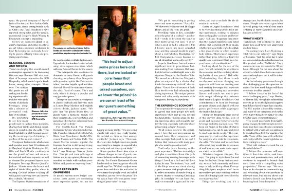 having as many drinks.“ We are seeing guests will enjoy one, really fantastic cocktail vs. three or four average cocktails,” Jackson says.“ However, there are also budget-conscious guests searching for a bargain or a special who actively seek out those great deals.”