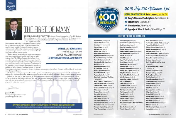 Thank you to our inaugural sponsor , the Distilled Spirits Council , for helping bring this program to life . We look forward to working with suppliers , wholesalers and technology providers on next year ’ s event as we build on the success of this year ’ s awards . Want to see your store on next year ’ s list ? Be sure to fill out a nomination form at BeverageDynamics . com / top100 starting in August , when the 2020 entries will open . Then next year you could be featured within the pages of this magazine , sharing the stage with innovative retailers from across the country . I look forward to reading all of your entries and continuing this awards program for many years to come ! •
