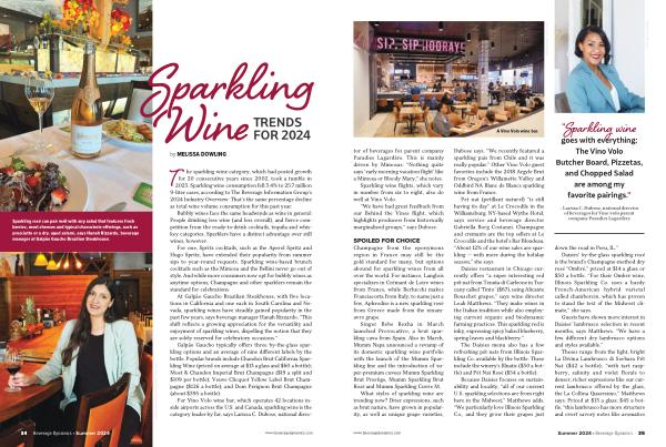 Theses range from the light , bright La Divina Lambrusco di Sorbara Pét Nat ($ 42 a bottle ), “ with tart raspberry , salinity and violet florals to denser , richer expressions like our current lambrusco offered by the glass , the La Collina Quaresimo ,” Matthews says . Priced at $ 13 a glass ; $ 45 a bottle , “ this lambrusco has more structure and overt savory notes like aromatics www . beveragedynamics . com Summer 2024 • Beverage Dynamics 35