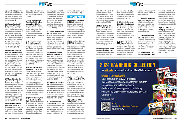 ( 91) L. Prima Chardonnay 2023( CA). From the Wente Family, this chardonnay has a lemon color. Classic California chardonnay with notes of crisp green apple followed by oak, vanilla and nice creaminess($ 17.99)