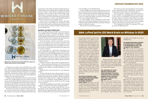 We had been outsourcing our bottling. Now, we’ ve started our own bottling program and it’ s been a homerun for us and the industry. There is a need in the market and other companies are coming to us for their bottling and it’ s turned into a nice win for us. It also makes us the only truly grain to glass distillery in the market. It’ s been great for our business. www. beveragedynamics. com Winter 2025 • Beverage Dynamics 23