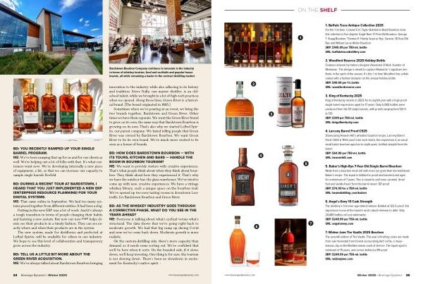 BD: HOW DOES BARDSTOWN BOURBON— WITH ITS TOURS, KITCHEN AND BARS— HANDLE THE BOOM IN BOURBON TOURISM? ME: We want to provide visitors with creative experiences. That’ s what people think about when they think about bourbon. They think about how they experienced it. That’ s why we have the outdoor bar, the glass warehouse. We’ ve tried to come up with new, creative experiences. We have a vintage whiskey library, such a unique space on the bourbon trail. We’ ve opened up two new tasting rooms in downtown Louisville, for Bardstown Bourbon and Green River.