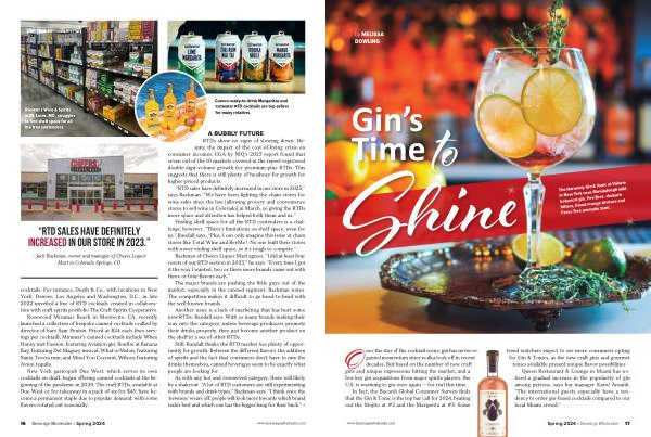 “ RTD sales have definitely increased in our store in 2023 ,” says Backman . “ We have been fighting the chain stores for wine sales since the law [ allowing grocery and convenience stores to sell wine in Colorado ] in March , so giving the RTDs more space and attention has helped both them and us .”