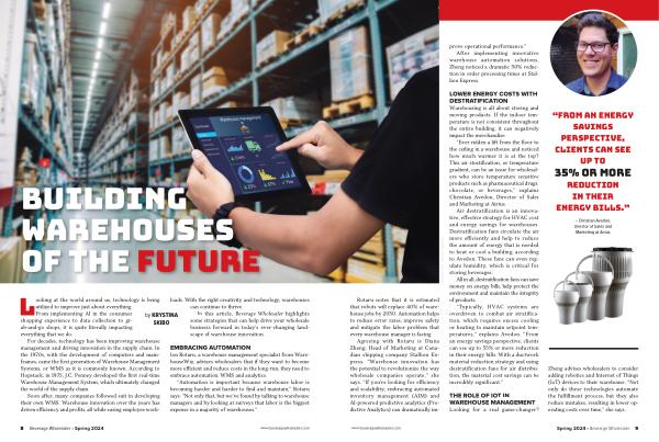 Zheng advises wholesalers to consider adding robotics and Internet of Things ( IoT ) devices to their warehouse . “ Not only do these technologies automate the fulfillment process , but they also reduce mistakes , resulting in lower operating costs over time ,” she says . www . beveragewholesaler . com Spring 2024 • Bevearge Wholesaler 9