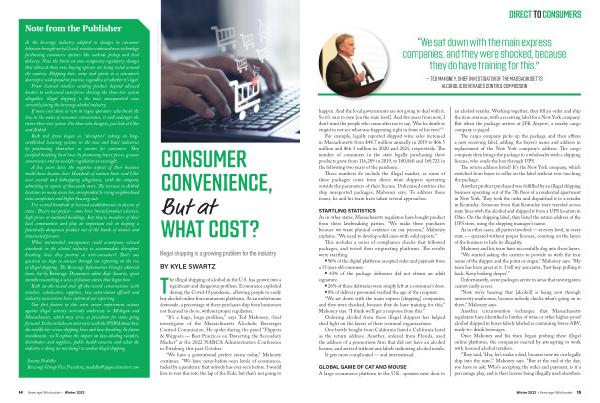 What unintended consequences could accompany relaxed standards in the alcohol industry to accommodate disruptors breaking laws they portray as anti-consumer ? That ’ s one question we hope to answer through our reporting on the rise of illegal shipping . The Beverage Information Group ’ s editorial team , led by Beverage Dynamics editor Kyle Swartz , spent months researching a series of feature stories that begin here .