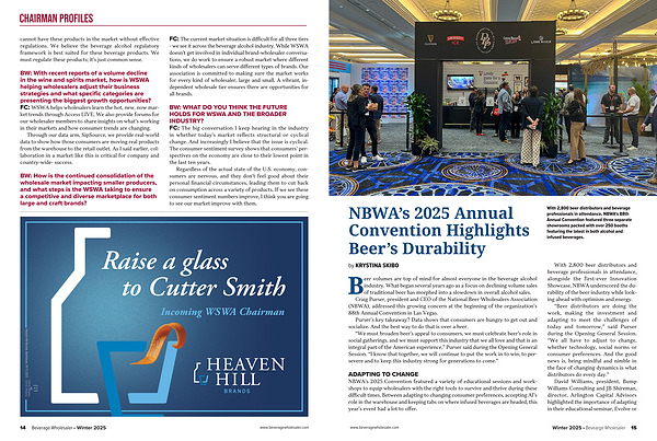Regardless of the actual state of the U. S. economy, consumers are nervous, and they don’ t feel good about their personal financial circumstances, leading them to cut back on consumption across a variety of products. If we see these consumer sentiment numbers improve, I think you are going to see our market improve with them. 14 Beverage Wholesaler • Winter 2025 www. beveragewholesaler. com