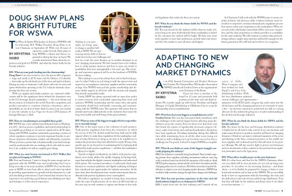 BW : What advice would you give to the next chairman ? GG : It ’ s often been said that for the NBWA Chairman , whatever you think will be your priorities , do not end up being your priorities . So my advice to our incoming chairman – and future chairs – is to be flexible , be prepared for change , to listen to your board and members and to lean on the NBWA . We are incredibly lucky to have an organization with the knowledge , the team and the dedication to advocate for beer and beverage distributors . Trust that they will fight for the industry and always strive to do what ’ s in our best interests . BW