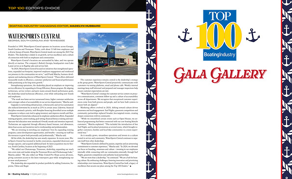 “ We are more than a dealership,” he continued.“ We are a hub for boating culture. By embracing challenges, fostering innovation and prioritizing relationships over transactions, WaterSports Central has built a legacy of excellence that secures our place among the Top 100 Dealers.”