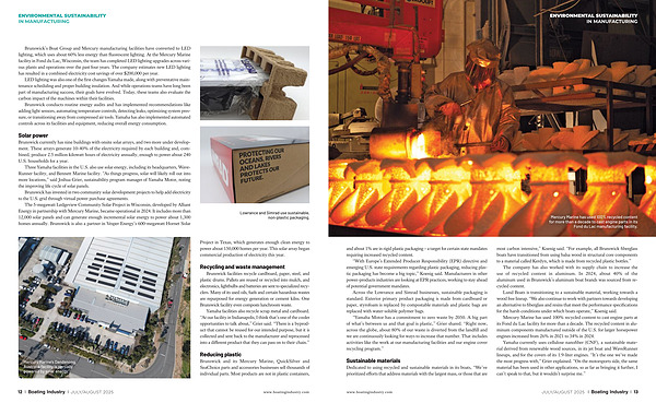 Brunswick conducts routine energy audits and has implemented recommendations like adding light sensors, automating temperature controls, detecting leaks, optimizing system pressure, or transitioning away from compressed air tools. Yamaha has also implemented automated controls across its facilities and equipment, reducing overall energy consumption.
