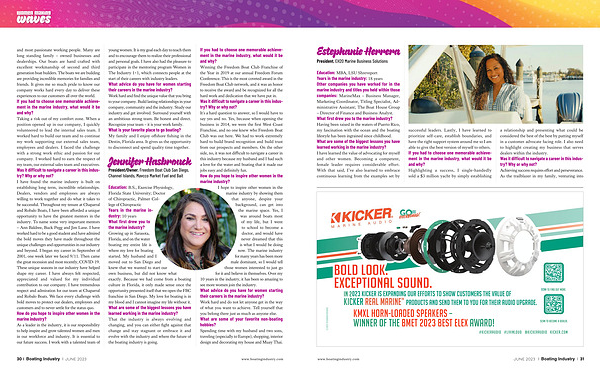 young women . It is my goal each day to teach them and to encourage them to realize their professional and personal goals . I have also had the pleasure to participate in the mentoring program Women in The Industry 1 + 1 , which connects people at the start of their careers with industry leaders . What advice do you have for women starting their careers in the marine industry ? Work hard and find the unique value that you bring to your company . Build lasting relationships in your company , community and the industry . Study our industry and get involved . Surround yourself with an ambitious strong team . Be honest and direct . Recognize your team – it is your work family . What is your favorite place to go boating ? My family and I enjoy offshore fishing in the Destin , Florida area . It gives us the opportunity to disconnect and spend quality time together .