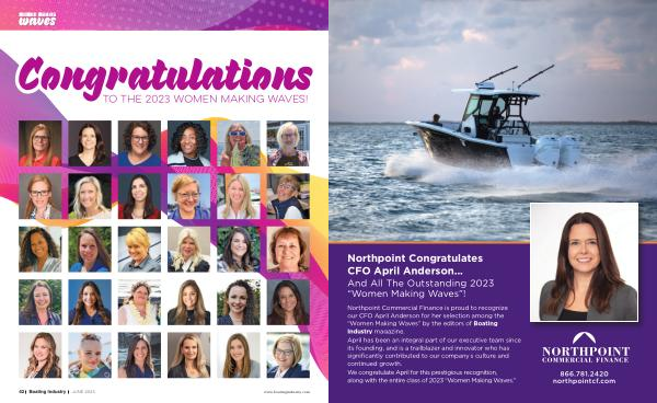 Northpoint Commercial Finance is proud to recognize our CFO April Anderson for her selection among the “ Women Making Waves ” by the editors of Boating Industry magazine . April has been an integral part of our executive team since its founding , and is a trailblazer and innovator who has significantly contributed to our company ’ s culture and continued growth . We congratulate April for this prestigious recognition , along with the entire class of 2023 “ Women Making Waves .”