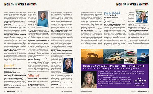 Resiliency ! Not everything happens according to our plan . We have all had to adapt along the way . From the recession of 2008 to the COVID pandemic , we all had to strengthen our agility , problem solving , and flexibility , and we are all better because of it . If you had to choose one memorable achievement in the marine industry , what would it be and why ? Being nominated by my peers for this award is truly a highlight . Human Resources is often a field that is outside of the limelight , which makes this honor even more special ! How do you hope to inspire other women in the marine industry ? When I joined the industry , I had a lot to learn . I devoted myself to learning about the industry , and importantly , about the people that make MarineMax so special . Making people ’ s lives better is my personal WHY , and I can fulfill that WHY in the field of Human Resources . Hopefully others will see that hard work along with a love of what you do , combined with WHY you do it . I hope others will see that if you are willing to put forth the effort , you will see the rewards . What advice do you have for women starting their careers in the marine industry ? Take advantage of every learning opportunity , spend time in other departments , ask questions , and soak up knowledge . Don ’ t be afraid to fail or step out of your comfort zone ― I ’ ve learned the most by saying “ yes ” when a new opportunity arises ― even if I wasn ’ t sure of the outcome or the outcome wasn ’ t what I expected . There is no such thing as failure if you learn from every experience .