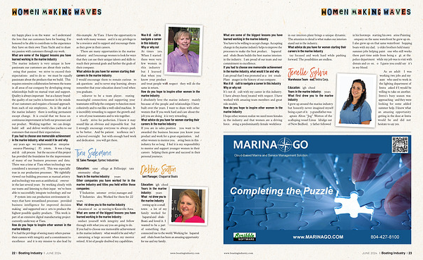What are some of the biggest lessons you have learned working in the marine industry ? You have to be willing to accept change . Accepting change in the marine industry helps to improve the processes to make the best product . Chaparral and Robalo Boats builds the best marine interiors in the industry . I am proud of our team and our commitment to excellence . If you had to choose one memorable achievement in the marine industry , what would it be and why ? I am proud that I was promoted as a First Female Plant Manager in the history of our company . Was it difficult to navigate a career in this industry ? Why or why not ? It ’ s not difficult with my career in this industry . I have always been treated with respect . I have worked with amazing team members and great role models . How do you hope to inspire other women in the marine industry ? I hope other women realize we need more females in the industry and that women are a driving force . Having a predominantly female workforce in our interiors plant brings a unique dynamic . The attention to detail is what makes our interiors stand out in the industry . What advice do you have for women starting their careers in the marine industry ? Stay focused and work hard while pushing forward . The possibilities are endless .