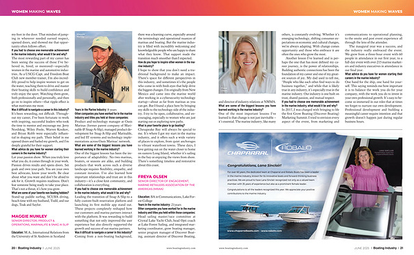my foot in the door. That mindset of jumping in wherever needed earned respect, opened doors, and showed me that opportunity often follows effort. If you had to choose one memorable achievement in the marine industry, what would it be and why? The most rewarding part of my career has been seeing the success of those I’ ve believed in, hired, or mentored ― especially women in the marine and automotive industries. As a USCG Capt. and Freedom Boat Club new member trainer, I’ m also incredibly proud to help inspire women to get on the water, teaching them to drive and master their boating skills to build confidence and truly enjoy the sport. Watching them grow, both professionally and personally, and then go on to inspire others ― that ripple effect is what motivates me most. Was it difficult to navigate a career in this industry? It’ s been rewarding, not difficult. Throughout my career, I’ ve been fortunate to work with inspiring, successful leaders who took the time to mentor and encourage me. Jerry Nordskog, Wiley Poole, Warren Kosikov, and Bryan Robb were especially influential in shaping my path. Their belief in me opened doors and fueled my growth, and I’ m deeply grateful for their support. What advice do you have for women starting their careers in the marine industry? Let your passion show. When you truly love what you do, it comes through in your work. Passion drives results and opens doors. Set goals and own your path. You are your own best advocate, know your worth. Be clear about what you want and don’ t be afraid to ask for it. Growth requires readiness. Don’ t fear someone being ready to take your place. That’ s not a threat, it’ s how you grow. What are some of your favorite non-boating hobbies? Stand-up paddle surfing, SCUBA diving, beach time with my husband, Todd, and our dogs, Teak and Saylor.