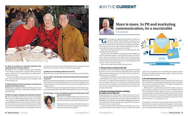 BI: What do you believe are important leadership traits needed by those in the marine industry? NC: Resilience. This is an industry with ups and downs. Purchases in the industry are almost always made with 100 % discretionary income – that means as the economy goes up, our industry grows. The reverse is also true.