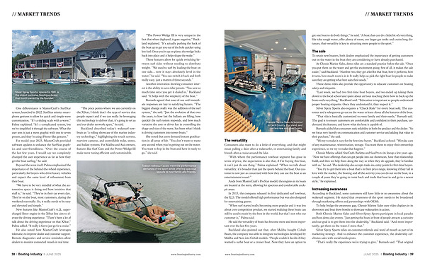 Another innovation drawing consumer interest is the ability to save rider presets.“ You save so much time once you get it dialed in,” Buckland said.“ It helps with the simplicity of the boat.”