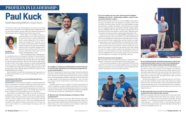 Today , the third generation is stepping up into key leadership positions , overseeing the Orlando , Fla . based workforce of 875 . Paul ’ s first grandson and his namesake Paul - son of Duane and Cindy - was recently appointed chief operating officer with responsibility for overall operations and results . With 15 years invested in daily business operations to date , he has already earned key accolades including leading his team to win the coveted Boating Magazine “ Boat of the Year ” award for its 29 OBX in 2016 , along with several top marketing recognitions . He ’ s previously been named a Boating Industry 40 Under 40 and serves on the NMMA BMD board of directors .