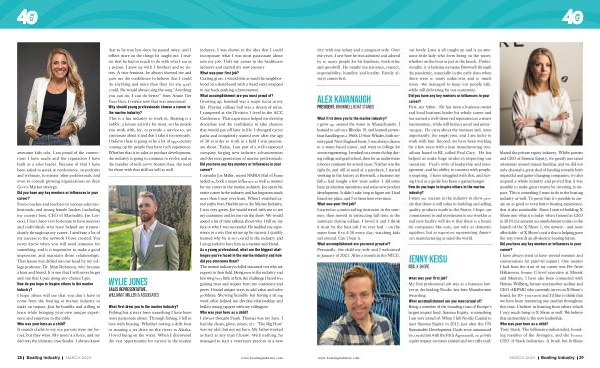 awesome kids solo , I am proud of the connections I have made and the reputation I have built as a sales leader . Because of that I have been asked to speak at conferences , on podcasts and webinars , to mentor other professionals , and even to consult growing organizations on their Go-to-Market strategy . Did you have any key mentors or influences in your career ? From coaches and teachers to various sales professionals , and strong female leaders ( including my current boss , CEO of Marinalife , Jen Leroux ), I have been very fortunate to have mentors and individuals who have helped me tremendously throughout my career . I attribute a lot of my success to the network I have created . You never know when you will need someone for something , and it is imperative to make a good impression and maintain those relationships . That lesson was drilled into my head by my college professor , Dr . Matt Robinson , who became a boss and friend . It is one that I will never forget and one that I pass along any chance I get . How do you hope to inspire others in the marine industry ? I hope others will see that you don ’ t have to come from the boating or marine industry to make an impact . Just be humble and willing to learn while bringing your own unique experience and expertise to the table . Who was your hero as a child ? It sounds cliché to say my parents were my heroes , but they were . My mom is a force , and my dad was the ultimate cheerleader . I always knew