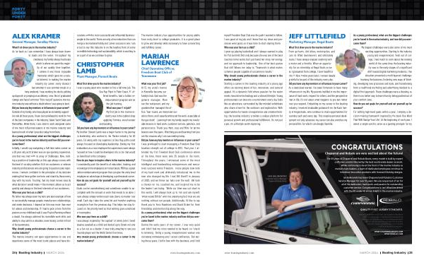 What was your first job ? At 12 , my uncle ' s marina in Knoxville became our family ' s hub . Dad was the general manager , Mom ran the restaurant , and my grandmother managed the office . Year-round , we immersed ourselves there , and I eagerly embraced the work , especially at the gas dock ! Learning from my family taught me invaluable lessons in hard work , customer service , patience , and perseverance . Thank you , Mom , Dad , and Mimi for all the lessons over the years . Watching you and learning from you are the reasons why I am succeeding today . Did you have any key mentors or influences in your career ? I was privileged to start managing a Freedom Boat Club location straight out of college in 2012 . That year , I attended my first Freedom Boat Club conference where at the time , there were only 25 people in the room . Throughout the years , I witnessed some of the most intelligent and hardworking entrepreneurs and executives succeed within Freedom . Those people took note of my hard work and ultimately introduced me to the man who changed my life . I met Bill Sheriff in January of 2020 , and we threw our hats over the wall . Bill took a chance on me , coached me , and inspired me to be the leader I am today . While our time was cut short in this world , I will always look up to him and ask myself , “ What would Bill do ” with the underlying fact that we are nothing without our people . Additionally , I ’ d like to say thank you to Ross Roadman and David Drake for their friendship and mentorship along the way . As a young professional , what are the biggest challenges you ’ ve faced in the marine industry and how did you overcome them ? During the early years of my career , I was very quiet and didn ’ t feel my voice needed to be heard , so I stuck to listening . Being a young , inexperienced woman was incredibly intimidating and I lacked confidence . But during those years , I fell in love with the business , and I told