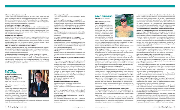What was your first job? I was a laboratory assistant for a cancer researcher at Marshall University. What accomplishments are you most proud of? Advocating with the entire NMMA team throughout 2020 to get the resources, information and policies our members needed to keep their facilities and businesses open during one of the most uncertain periods of time any of us had faced. Did you have any key mentors or influences in your career? John McKnight has always been generous with his knowledge and understanding of the industry and issues we have faced over the years. As a young professional, what are the biggest challenges you’ ve faced in the marine industry and how did you overcome them? Initially, it can feel overwhelming jumping in a place with deep institutional experience, but this industry is filled with many people who want to share what they ' ve learned – all you have to do is be curious and ask questions. How do you hope to inspire others in the marine industry? There isn ' t a one-size-fits-all approach. Be yourself. Know your core values and principles and operate every decision through those. How do you set goals for yourself and set yourself up for success? I think in systems – not putting too much weight in the result – and what sort of habits would I build to achieve that end result. For example, I want to run a marathon in six months, but instead of just focusing on that end result, I think about what type of person I would be in six months running a marathon. So, between now and then, I probably need to be disciplined, consistent, eat healthy, exercise routinely and get plenty of sleep. Those habits are unlikely to just go away after that race, and I will continue to practice. I apply that same thinking to goals both professionally and personally. What boat did you learn to boat on? 27-foot Catalina sailboat. Where is your favorite place to go boating? It was my introduction to boating, so the Florida Keys. Who was your hero as a child? My dad, and it just so happens he introduced me to the industry. What are some of your favorite non-boating hobbies? Any activity with my wife and daughter, especially fishing, hiking and biking. Why should young professionals choose a career in the marine industry? In its simplest form, every day you try to make it a little easier to get more people out on the water, which sounds like a pretty fun career to me.