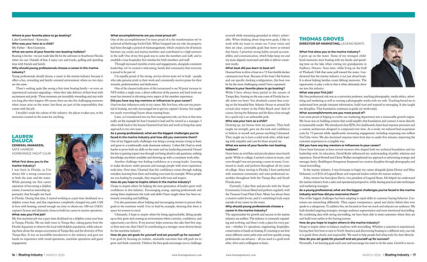 yourself while remaining grounded in what’ s achievable. When thinking about long-term goals, I like to work with my team to create our 5-year vision and then set clear, actionable goals that move us toward that future. I prioritize strong habits around accountability and communication, which helps keep me and my team aligned, motivated and able to deliver consistent results. What boat did you learn to boat on? I learned how to drive a boat on a 72-foot double decker catamaran tour boat. Because of the boat’ s flat bottom and our specific docking configuration, this boat was by far the most challenging vessel I have captained. Where is your favorite place to go boating? While I have always been partial to the sunsets of Tampa Bay, boating on the east coast of Florida has really stolen my heart. You absolutely cannot beat cruising on the beautiful blue Atlantic Ocean or around the crystal-clear waters in the Palm Beach area! And of course, having the Bahamas and the Keys close enough for a quick trip is an unbeatable perk. Who was your hero as a child? Growing up, my heroes were my parents. They both taught me strength, gave me the tools and confidence to believe in myself and pursue anything I dreamed. They taught me to have a solid work ethic, while leading with empathy and care for those around me. What are some of your favorite non-boating hobbies? I have been an avid flute and piccolo player since fourth grade. While in college, I earned a minor in music, and even though I was not pursuing a career in music, I continued to study and perform throughout all my years of college. Since moving to Florida, I have performed with numerous community and semi-professional ensembles throughout both the Tampa Bay and South Florida areas.