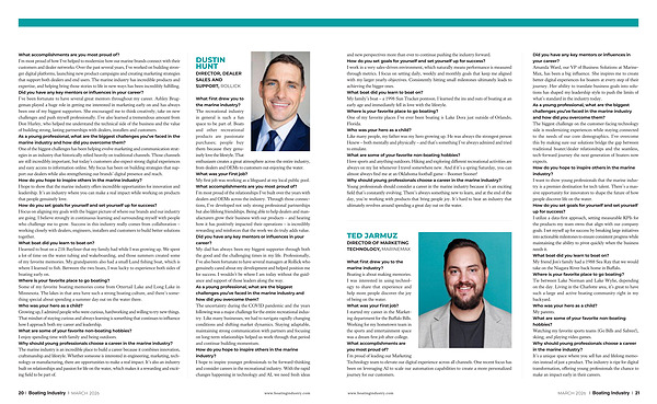 What was your first job? My first job was working as a lifeguard at my local public pool. What accomplishments are you most proud of? I’ m most proud of the relationships I’ ve built over the years with dealers and OEMs across the industry. Through those connections, I’ ve developed not only strong professional partnerships but also lifelong friendships. Being able to help dealers and manufacturers grow their business with our products – and hearing how it has positively impacted their operations – is incredibly rewarding and reinforces that the work we do truly adds value. Did you have any key mentors or influences in your career? My dad has always been my biggest supporter through both the good and the challenging times in my life. Professionally, I’ ve also been fortunate to have several managers at Rollick who genuinely cared about my development and helped position me for success. I wouldn’ t be where I am today without the guidance and support of those leaders along the way. As a young professional, what are the biggest challenges you’ ve faced in the marine industry and how did you overcome them? The uncertainty during the COVID pandemic and the years following was a major challenge for the entire recreational industry. Like many businesses, we had to navigate rapidly changing conditions and shifting market dynamics. Staying adaptable, maintaining strong communication with partners and focusing on long-term relationships helped us work through that period and continue building momentum. How do you hope to inspire others in the marine industry? I hope to inspire younger professionals to be forward-thinking and consider careers in the recreational industry. With the rapid changes happening in technology and AI, we need fresh ideas