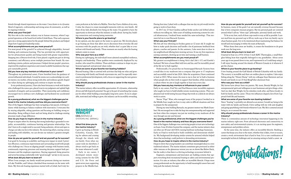When those three areas are healthy, it creates the foundation to do great work over the long term. What boat did you learn to boat on? I learned to boat on a 1976 14-foot 3-inch K & C Thermoglass, a small fiberglass fishing boat that originally belonged to my grandfather. About seven years ago it was passed down to me, and I repowered it so I could keep using it. I still enjoy buzzing around the islands of Western Canada in it whenever I get the chance. Where is your favorite place to go boating? I love boating around the Gulf Islands of British Columbia with my family. The scenery is incredible and there are endless places to explore. I also enjoy fishing along the“ Honey Hump” with my colleague Sean Battistoni and our friends and family in our 25-foot KingFisher aluminum boat. Who was your hero as a child? My heroes have always been my parents. My mom, Brenda Wright, for her entrepreneurial spirit and willingness to start businesses and give things a shot. And my dad, Ken Wright, for his relentless work ethic and fierce loyalty to both his family and his career. Those two influences shaped a lot of how I approach both life and business. What are some of your favorite non-boating hobbies? Since“ boating” is probably not allowed as an answer, I would say being in the water with my family and friends. I love surfing with my wife and daughter and going spearfishing with friends whenever I can. My life is centered around being in, on or around the water. Why should young professionals choose a career in the marine industry? There is a tremendous amount of technology innovation happening in the marine industry right now. From advanced electronics and connectivity to new safety and environmental systems, it is an exciting space for engineers, entrepreneurs and problem solvers.