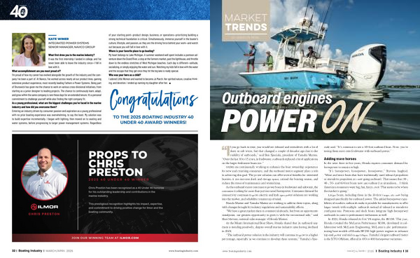 In 2023 , Honda released its first V8 engine , the BF350 . This year , Honda revealed the McLaren Performance M300 , developed in collaboration with McLaren Engineering . McLaren is also performancetuning base models of Honda BF250 high-power engines to enhance top-end power and mid-range torque . Yamaha ’ s largest outboard motor is the XTO Offshore , offered in 450 or 400 horsepower variations . www . boatingindustry . com march / april 2025