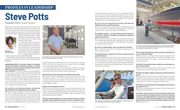 When selecting a personality to profile for the Boating Industry Top Products Issue , veteran boat builder Steve Potts was a natural choice . As founder and CEO of Scout Boats , Potts has been fully immersed in product design and development for 57 years , from his earliest days as a teenager working at a retail dealership where he found his passion tinkering on a skiff named Scout , to a fulfilling lifelong career encompassing everything from small trailer boats to sailing vessels , yachts and center consoles .