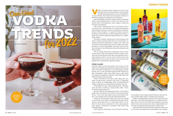 FRESH FLAVORS Flavored vodkas overall have grown 5 % of share on the online alcohol ordering and delivery platform Drizly since 2019 . Citrus flavors dominate , as the subcategory is led by brands such as the lemonade-inspired Pink Whitney by New Amsterdam vodka , Deep Eddy Lemon vodka , Ketel One Botanical Grapefruit and Rose , Deep Eddy Ruby Red vodka and Absolut Citron vodka .