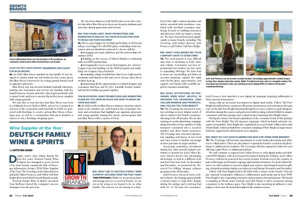 BIG : WHAT ACTIVATIONS OR PRO- GRAMS WERE MOST HELPFUL IN GROWING THE CROSSINGS , JOSH CELLARS RESERVE AND PROSECCO , AND YELLOW TAIL PURE BRIGHT ? TS : The Crossings has invested in new , eye-catching in-store display point of sale to reinforce the brand ’ s coastal positioning in the off-premise . We are also running an aerial advertising campaign along shorelines in key markets to help transport consumers into a vacation mindset and drive brand awareness . The Crossings also executed experiential sampling activations at key food and wine events to further encourage in-store purchase in target markets .