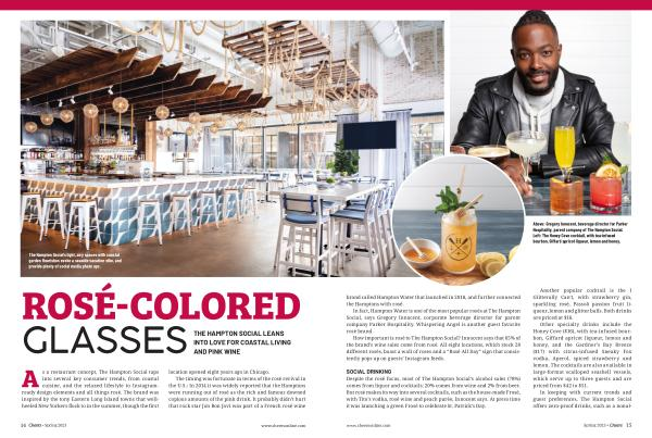 SOCIAL DRINKING Despite the rosé focus , most of The Hampton Social ’ s alcohol sales ( 78 %) comes from liquor and cocktails ; 20 % comes from wine and 2 % from beer . But rosé makes its way into several cocktails , such as the house-made Frosé , with Tito ’ s vodka , rosé wine and peach purée , Innocent says . At press time it was launching a green Frosé to celebrate St . Patrick ’ s Day .