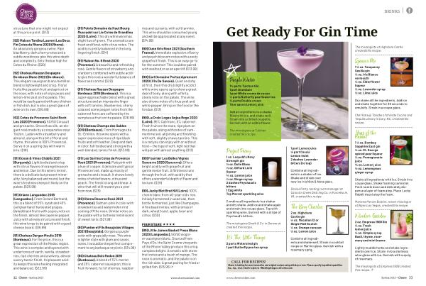 ( 91 ) Les Sarrins Cotes de Provence Rosé 2021 ( Provence ). Pale pink with a hue of copper . A delicate and typical Provence rosé , made up mostly of grenache and cinsault . It shows lovely notes of white flowers , citrus and peach . The finish is long and linear . A wine that will still reward you a year from now . ($ 25 )