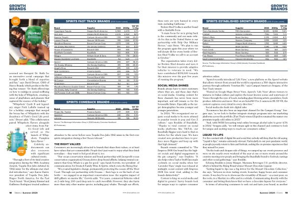 Casamigos Tequila Diageo North America 2,360 2,470 4.7 % Don Julio Diageo North America 2,078 2,454 18.1 % Espolon Tequila Campari America USA 1,110 1,368 23.2 % Lunazul Tequila Heaven Hill Brands 918 1,266 37.9 % Woodford Reserve Brown-Forman Corp . 1,079 1,181 9.5 % Ole Smoky Moonshine Ole Smoky Distillery 847 851 0.5 % House of Cazadores Bacardi USA 759 833 9.7 % BuzzBallz Cocktails BuzzBallz 722 805 11.5 % Milagro William Grant & Sons 605 778 28.6 % Biggies BuzzBallz Cocktails BuzzBallz 112 629 ++% Aperol Campari America USA 390 547 40.3 % Ole Smoky Whiskey Ole Smoky Distillery 315 395 25.4 % Angel ' s Envy Bacardi USA 295 301 2.0 % Gran Centenario Proximo Spirits 230 266 15.7 % Campari Campari America USA 227 243 7.0 % Jefferson ' s Bourbon Pernod Ricard USA 177 196 10.7 % Mi Campo Constellation Brands 94 161 71.3 % St Germain Bacardi USA 152 157 3.3 % Woodford Reserve Double Oaked Brown-Forman Corp . 139 141 1.4 % Ole Smoky Salty Caramel Ole Smoky Distillery 128 140 9.4 % Old Forester Craft and SBBL Brown-Forman Corp . 102 103 1.0 %