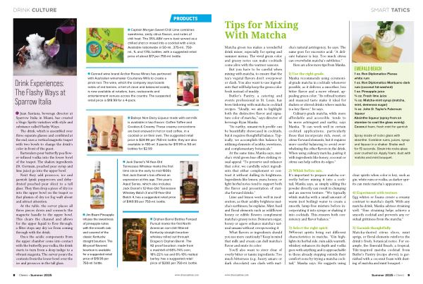 5) Garnish thoughtfully. Matcha-dusted citrus slices, mint sprigs, or floral elements reinforce the drink’ s fresh, botanical notes. For example, the Emerald Beach, a tropical, Tiki-inspired matcha cocktail from Butler’ s Pantry( recipe above), is garnished with a coconut foam with dusting of matcha and mint bouquet. • www. cheersonline. com Summer 2025 • Cheers 9