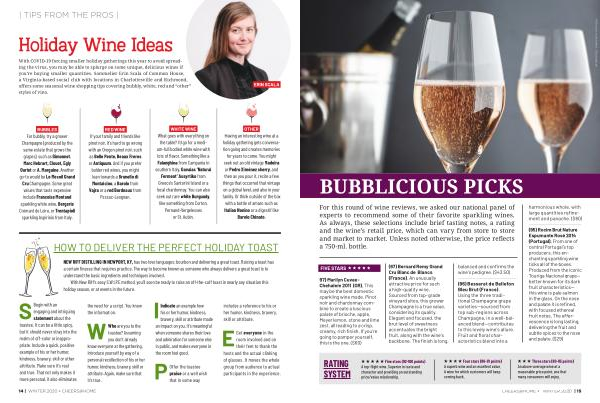 BUBBLES For bubbly , try a grower Champagne ( produced by the same estate that grows the grapes ), such as Gimonnet , Marc Hebrart , Clouet , Egly Ouriet or A . Margaine . Another go-to would be Le Mesnil Grand Cru Champagne . Some great values that taste expensive include Francoise Montand sparkling white wine , Bergerie Crémant de Loire , or Trentapioli sparkling Aspirinio from Italy . |