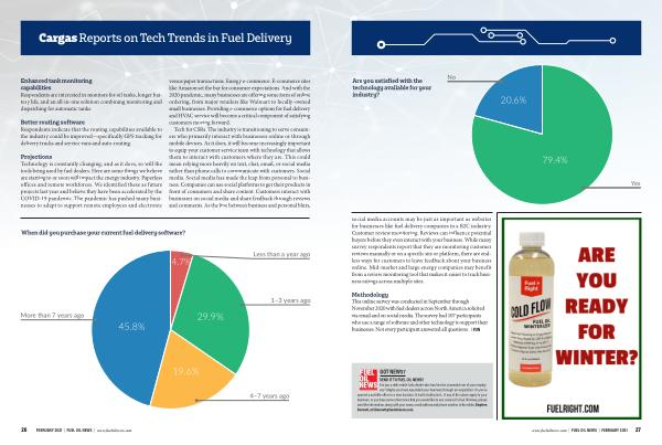 Methodology This online survey was conducted in September through November 2020 with fuel dealers across North America solicited via email and on social media . The survey had 107 participants who use a range of software and other technology to support their businesses . Not every participant answered all questions . l FON