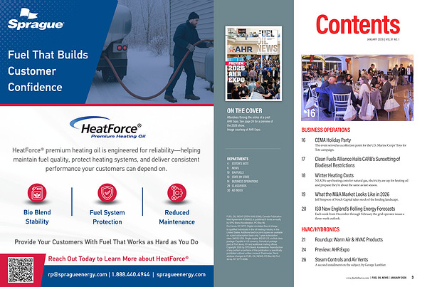 FUEL OIL NEWS( ISSN 0016-2396), Canada Publication Mail Agreement # 1588621, is published 9 times annually by EPG Brand Acceleration, PO Box 96, Port Jervis, NY 12771. Digital circulated free of charge to qualified individuals in the oil heating industry in the United States. Additional and / or print copies are available on a paid subscription basis only. 1-year subscription rates: $ 40.00 USA. Single copies: $ 12.00 U. S. via first-class postage. Payable in US currency. Periodical postage paid at Port Jervis, NY and additional mailing offices. Copyright 2026 by EPG Brand Acceleration. Reproduction of any portion or portions of this publication is specifically prohibited without written consent. Postmaster: Send address changes to FUEL OIL NEWS, PO Box 96, Port Jervis, NY 12771-0096.