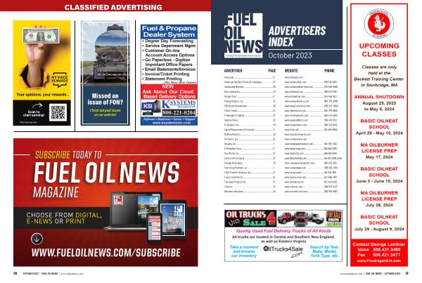 www . ahrexpo . com www . meterticket . com ............................... 800-519-3691 www . automatedwireless . com .................. 973-663-6990 www . bettsind . com .................................... 800-831-7160 www . dropletfuel . com ................................ 203-456-1012 www . energykinetics . com .......................... 908-735-2066 www . epgacceleration . com ....................... 800-323-2066 www . felkertruck . com ................................ 920-779-9826 www . firedragonent . com ........................... 508-421-3490 www . generalfilters . com ............................ 866-476-5101 www . ksystemsinc . com ............................. 800-221-0204 www . lmnc . net ............................................ 610-489-0900 www . myvoicerewards . com www . oiltankcrank . com www . otodatatankmonitors . com ...................... 844-763-3344 www . beckettcorp . com ....................................... 800-645-2876 www . raymurray . com .......................................... 800-628-5044 www . Oiltrucks4Sale . com ................................... 401-942-5000 x . 2135 www . savageassociatesinc . com ................ 908-234-1216 www . stargrouplp . com ............................... 888-440-4944 www . tacocomfort ...................................... 401-942-800 www . taurus-plus . com ............................... 207-666-3167 www . tjernlund . com ................................... 651-426-2993 www . tremcar . com ..................................... 888-873-6227 www . westmor-ind . com ............................. 800-992-8981 www . fueloilnews . com | FUEL OIL NEWS | OCTOBER 2023 31