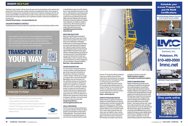 SKYBITZ TANK MONITORING SkyBitz Tank Monitoring provides remote monitoring and analytics for storing liquids and compressed gases in the petroleum, chemical, water and agriculture industries. Suppliers, distributors, and production managers optimize their operating efficiency through wireless tank monitoring and receive a rapid ROI based upon reduced tank servicing costs and improved inventory management. Our advanced wireless tank monitoring system gives you the ability to know who needs product – when, where and how much. Single tank, multi-tank, tank farm, bulk, mini bulk or tote, you’ ll have 24 / 7 access to critical tank level data and the alerts, alarms and notifications we provide via the SMARTank Tank Level and Analytics Portal give you total visibility into the tank at all times.“ We Make Your Tanks Talk.” Use our system to eliminate run-outs and costly emergency deliveries, improve delivery www. fueloilnews. com | FUEL OIL NEWS | OCTOBER 2025 15