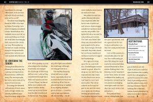 trail . After gassing up and returning to the winding local trails , we enjoyed the challenge of following drifted-over trails as they meandered through farm fields and sparse patches of trees . Dense , hardened drifts were mixed with lighter , fresher drifts , meaning we never knew how the skis would react to the terrain . The angry |