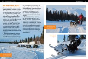 Snowmobile routes in the woods and swamps of Alaska are typically marked with brightly colored tape that ’ s tied to a tree branch . This way resort owners can haul in supplies on their “ Super Wide ” utility snowmobiles , as they ’ re called , and recreational sledders like us can follow the trails for fun . Many of the rivers had painted wood laths sticking out of the snow pack , also with bright ribbons attached .